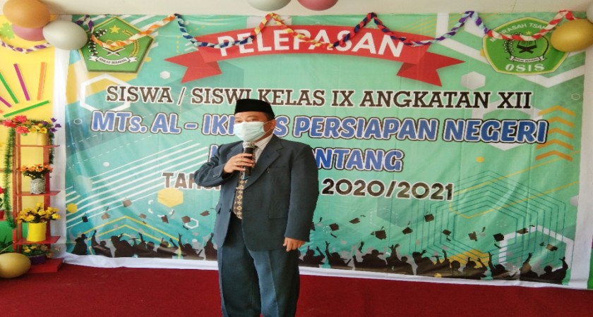 Selasa, 1 Juni 2021, Resmi kelas IX MTs Al-Ikhlas di lepas atau di nyatakan Tamat, itu di tandainya dengan acara Pelepasan Siswa/i kelas IX Angkatan XII, kali ini berbeda di tahun tahun sebelumnya yang biasa diadakan dengan meriah dan hadiri wali siswa. Namun acara pelepasan ini tidak kalah seru, karena tetap diadakan secara seremonial dan di hadiri oleh Kepala Kantor Kementrian Agama Bontang Bapak H. Muhammad Isnani, S.Ag.,M.Pd, selain itu dihadiri pula Pengawas Madrasah Bapak Ismail, dalam sambutanya Kepala Kementrian Agama menyampaikan pesan bahwa Alumni harus bisa berguna di masyarakat dan bisa menjaga nama baik Madrasah.